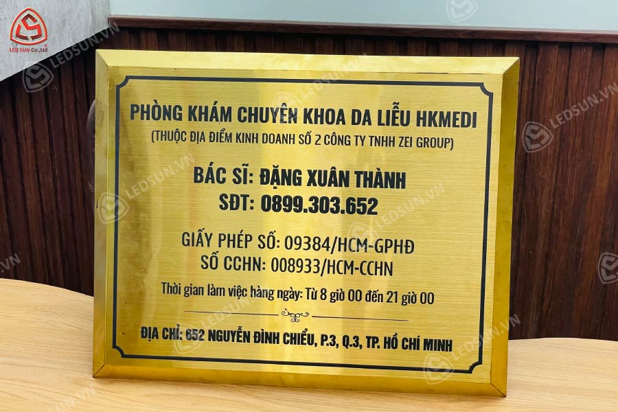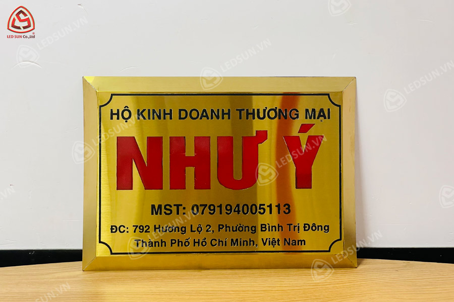 Bảng tên inox vàng xước có thể kết hợp với các loại khung, nền gỗ, mica hoặc đèn LED để tạo điểm nhấn, phù hợp với không gian từ cổ điển đến hiện đại.