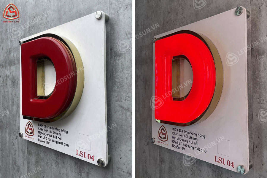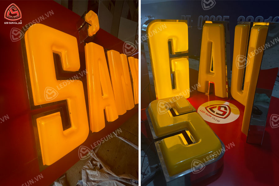 Chữ nổi inox vàng bóng mặt mica hút nổi là loại chữ được làm từ inox vàng bóng kết hợp với mica hút nổi, tạo nên một hiệu ứng thẩm mỹ đẹp và nổi bật. Loại chữ này được sử dụng phổ biến trong thiết kế bảng hiệu, logo, biển quảng cáo ngoài trời và các công trình cần sự sang trọng, dễ nhìn và bền bỉ. Cấu trúc này mang lại khả năng chiếu sáng tốt và dễ dàng thu hút sự chú ý.