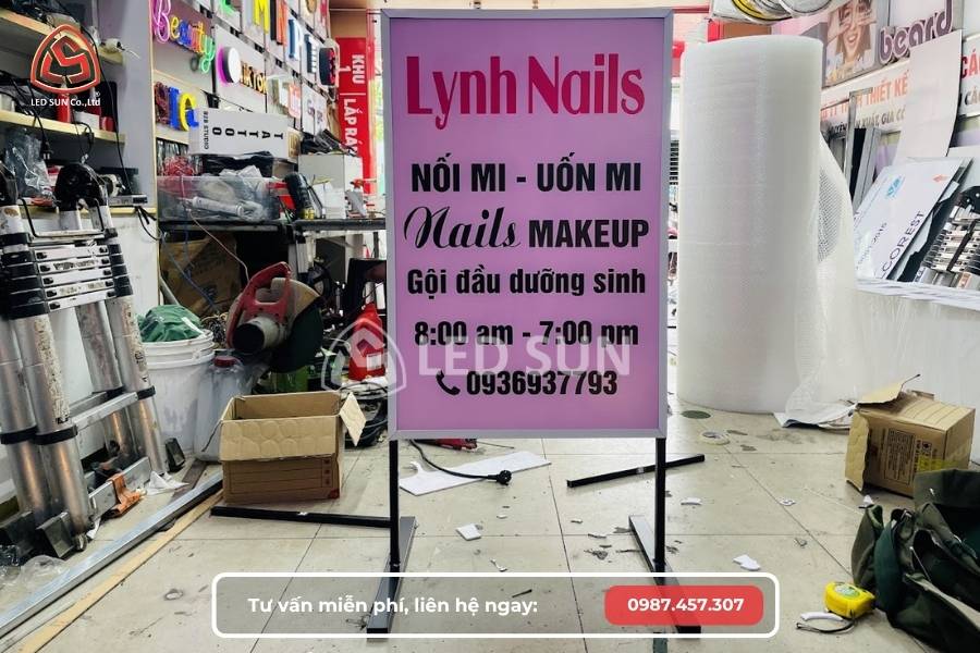 Hộp đèn bạt có chân là một dạng biển quảng cáo sử dụng khung sắt hoặc inox làm chân đứng kết hợp với mặt bạt in Hiflex căng sáng, bên trong lắp hệ thống đèn LED chiếu sáng. Thiết kế này cho phép hộp đèn đặt độc lập trên mặt đất mà không cần gắn tường, thường được bố trí trước cửa hàng, quán ăn, tiệm tóc hoặc các khu vực có lưu lượng người qua lại cao. Nhờ tính linh hoạt, dễ thay đổi nội dung và khả năng hiển thị tốt cả ngày lẫn đêm, hộp đèn bạt có chân là giải pháp truyền thông hiệu quả với chi phí hợp lý.