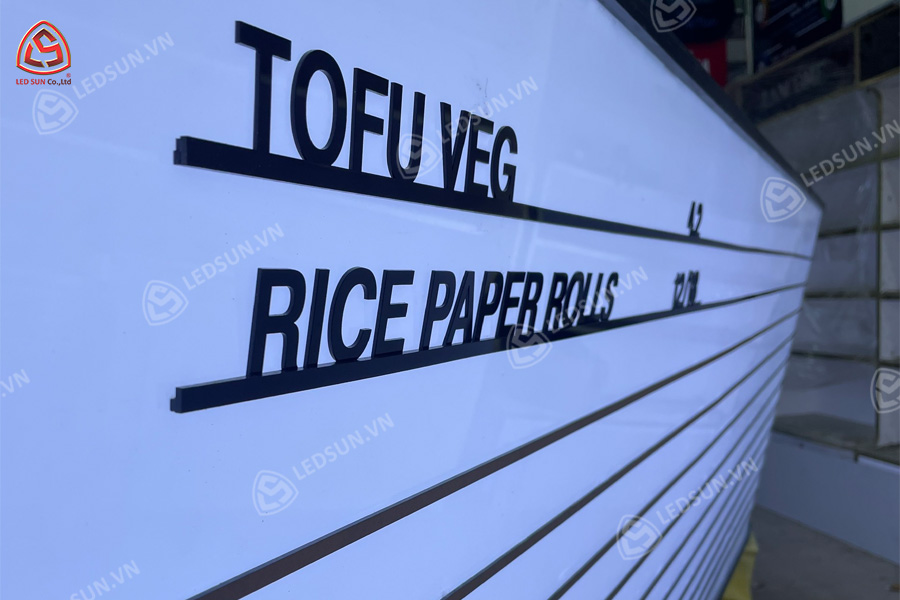 - Lớp decal hoặc chữ nổi: Tuỳ theo thiết kế, mặt poly sẽ được dán decal xuyên sáng hoặc gắn chữ mica nổi để tạo điểm nhấn thương hiệu.